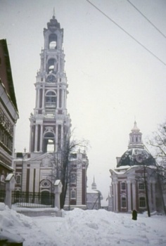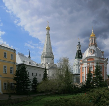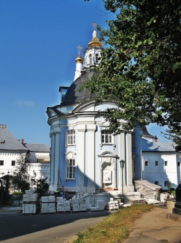 Смоленский храм (1746-1753) — яркий образец елизаветинского барокко по проекту Д. Ухтомского. Круглый в плане объём с четырьмя криволинейными нишами, волнообразным карнизом и световым фонарём возведён на средства графа Алексея Разумовского для чудотворной резной каменной иконы «Одигитрия». Торжественное освящение 6 июня 1753 года совершил митрополит Платон в присутствии императрицы Елизаветы. В интерьере повторён круглый мотив: колонны-«раковины», резной иконостас на 360°, — благодаря чему паломники обходят храм по часовой стрелке.