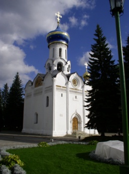 Духовская церковь — второй каменный храм Лавры (1476-1477) и старейший в Руси образец типа «иже под колоколы»: звонница интегрирована в цилиндрический барабан, опирающийся на своды основного четверика. Построенная псковскими мастерами по указу великого князя Ивана III, она стала экспериментальной площадкой московского кирпичного строительства. Пояс из терракотовых балясин с поливными изразцами (в центре кокошников — зелёные медальоны с розетками) считается предтечей узорочья конца XVI в. В XVII в. храм расписывался артелью Степана Рязанца, сохранились клейма «Деисус» и «Чудо в Кане». На звоннице до 1918 г. висел «всполошной» колокол — сигнал тревоги для всей Радонежской земли.