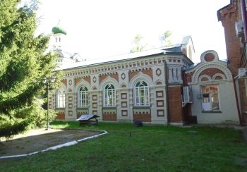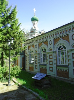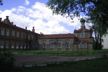 Храм представляет собой кирпичное одноглавое сооружение, выполненное в стилизованных формах древнерусской церковной архитектуры. Килевидные окна, многослойные карнизы и закомары в виде трёхлопастных завершений фасадов четверика храма отражают влияние древнерусского зодчества. Сочетание серой штукатурки и красного кирпича придаёт зданию выразительный облик, нехарактерный для провинциальной архитектуры того времени. Храм соединён переходной галереей с главным зданием больницы, что подчёркивает его функциональную связь с медицинским учреждением.