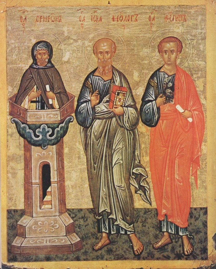 Святые Симеон Столпник, Иоанн Богослов, апостол Филипп. Икона (таблетка). Новгород. Конец XV в. 24 х 19. Из Софийского собора. Новгородский музей.