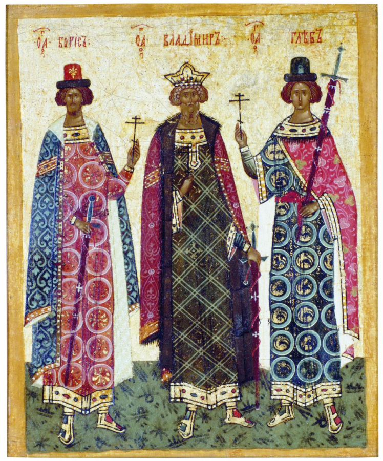 Святые Владимир, Борис, Глеб. Икона (таблетка). Новгород. Конец XV в. 24 х 19. Из Софийского собора. Новгородский музей.