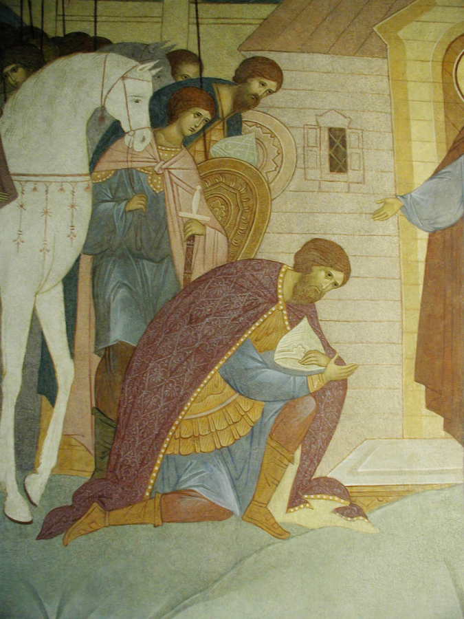 Преподобный Сергий благословляет святого Димитрия Донского на Куликовскую битву. Монахиня Иулиания (Соколова). Роспись Серапионовой палаты. Троице - Сергиева Лавра. 1949 г.