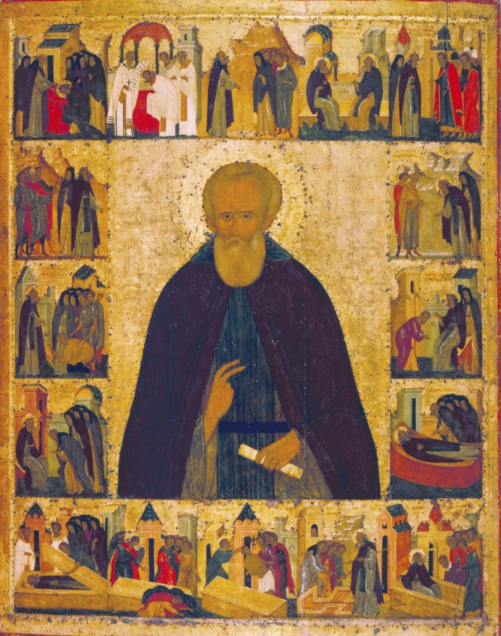 Прп. Димитрий Прилуцкий с житием. Мастерская Дионисия. Икона. Москва. Конец XV в. (до 1503 г.). 139.5 х 111. Из Спасского собора Спасо-Прилуцкого монастыря. ВГИАХМЗ. г. Вологда.