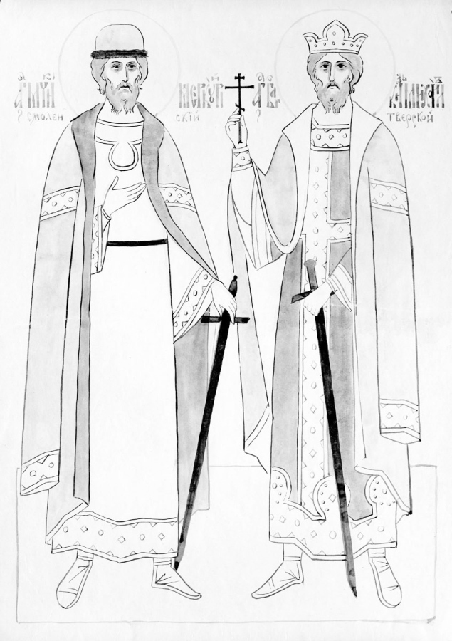 Свв. Меркурий и Михаил. Монахиня Иулиания (Соколова). Рисунок. Сергиев Посад. 1957 - 1980 годы. 40.7 х 28. Прорись - образец иконописного кружка. Собрание Иконописной школы.