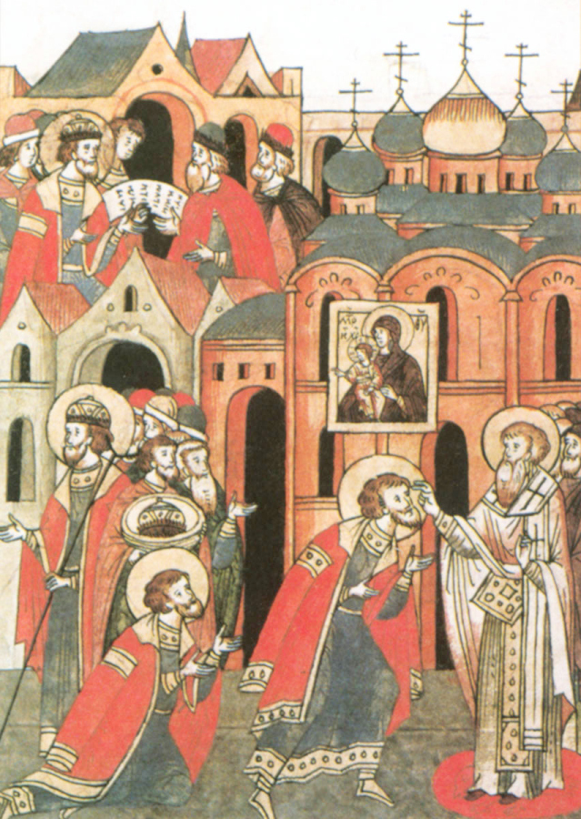 Молитва Александра Невского в храме Святой Софии и благословение его архиепископом перед битвой. Миниатюра Лицевого Летописного свода. Москва. XVI в.