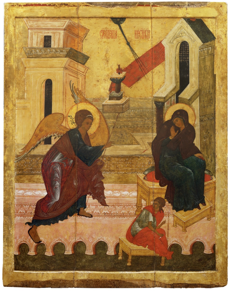 Эта икона посвящена Благовещению Пресвятой Богородицы.