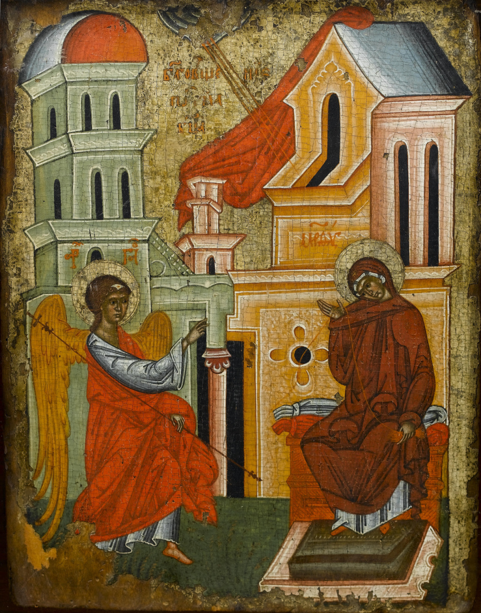 Эта икона посвящена Благовещению Пресвятой Богородицы.