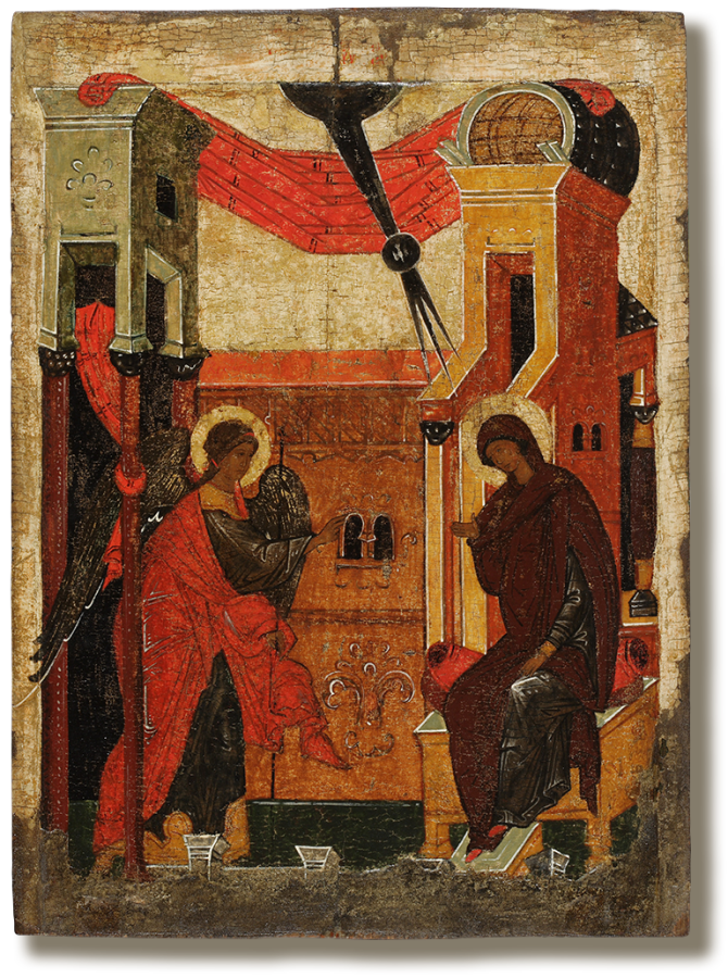Видимо, та же тема храма Соломона была продолжена мастером в изображении открытого портика, из которого стремительно исходит архангел Гавриил. Высокие, стройные фусты колонок, перекрывающие его фигуру, а также мотив киноварной завесы, особым образом завязанной на одной из них, – редкая иконографическая подробность сцены, берущая свое начало в византийском искусстве и хорошо известная в иконописи Пскова XVI в. К числу особенностей публикуемой иконы следует отнести своеобразный рисунок складок мафория, необычно драпирующих фигуру Марии, – они оставляют открытыми и обрисовывают Ее левый рукав и колено, – а также типично псковскую по формам орнаментацию высокой стены с двойным окном в центре.