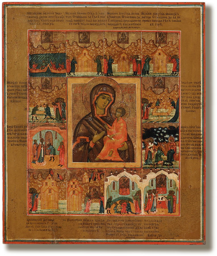 Икона Богоматерь Тихвинская, с циклом сказания в 12 клеймах. Конец XVIII – начало XIX века. Выг