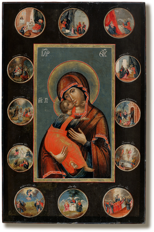 Икона Богоматерь Владимирская, с двунадесятыми праздниками. Последняя четверть XVIII века. Ростовские или владимирские земли