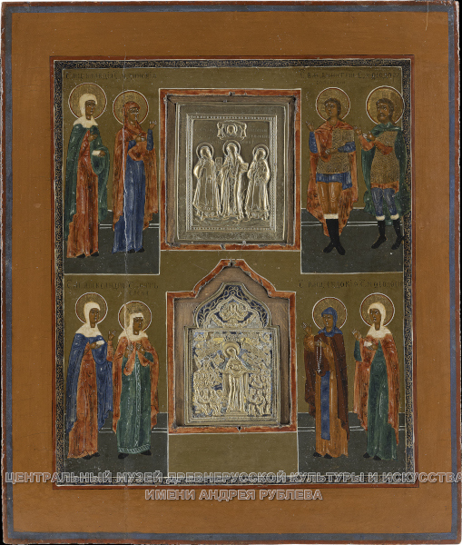 Избранные святые, с врезанными меднолитыми иконами «святители Иоанн Златоуст, Василий Великий, Григорий Богослов» И «БОГОМАТЕРЬ Всех скорбящих радость». Конец XIX века. Врезные иконы: XIX век. Центральная Россия