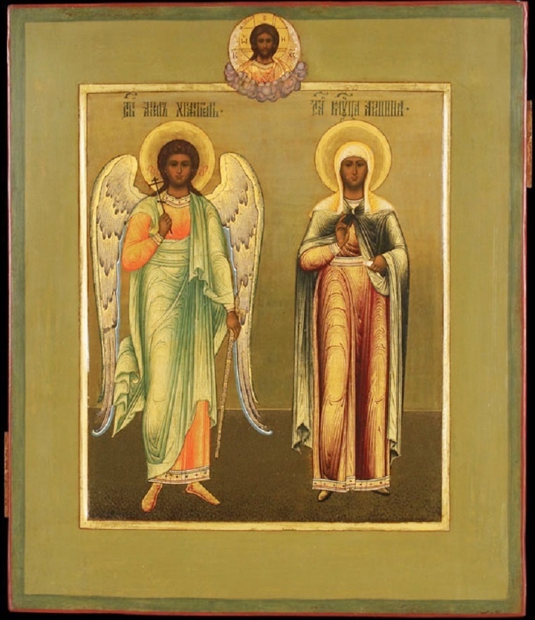 Святые Ангел Хранитель и мученица Агриппина. Около 1900 г. Москва. Атрибутировано как Гурьянов. 31 х 26.5 см. Частное собрание.