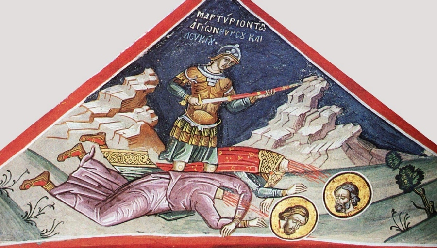 Мучение свв. Фирса, Левкия, Филимона, Аполлония, Ариана, Каллиника. Тзортзи (Зорзис) Фука. Фреска. Афон (Дионисиат). 1547 г.