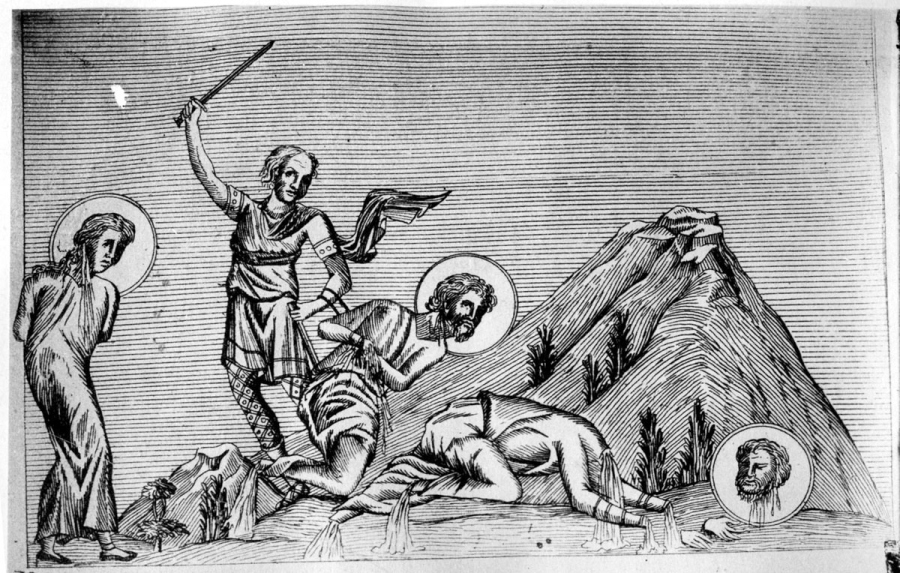 Мчч. Максим, Феодот, Асклиада (Асклипиодота). Миниатюра Минология Василия II. Константинополь. 985 г. (копия - гравюра из издания Албани). Ватиканская библиотека. Рим.
