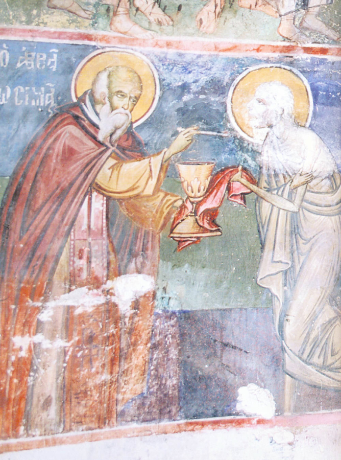 Причащение прп. Марии Египетской в пустыне Фреска в русской келлии святого первомученика архидиакона Стефана. Афон. XVII век.