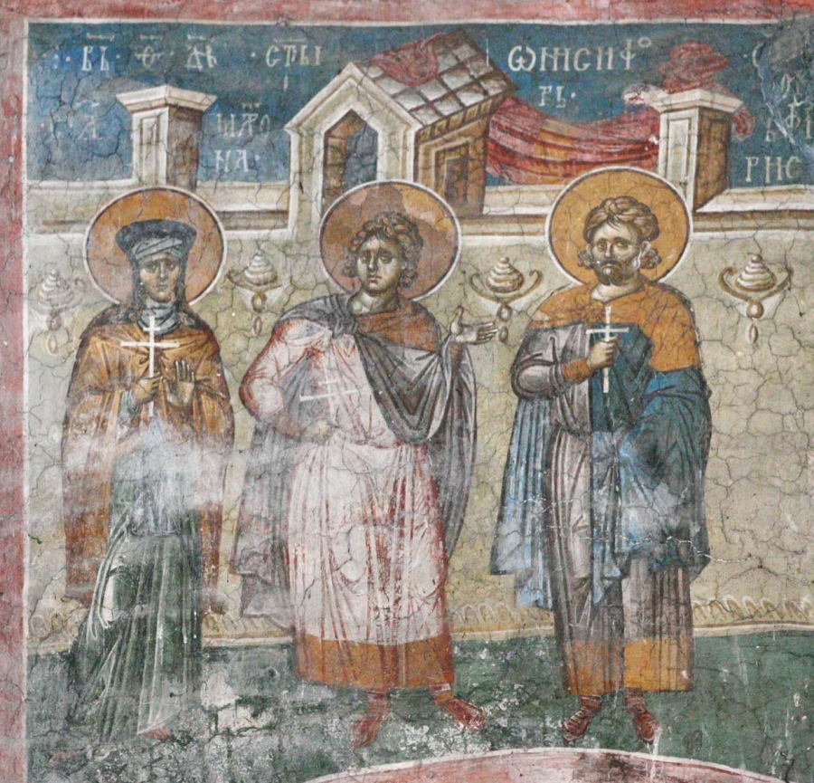 Прп. Матрона, мчч. Онисифор и Порфирий. Фреска. Церковь Христа Пантократора. Дечани. Косово. Сербия. Около 1350 года.
