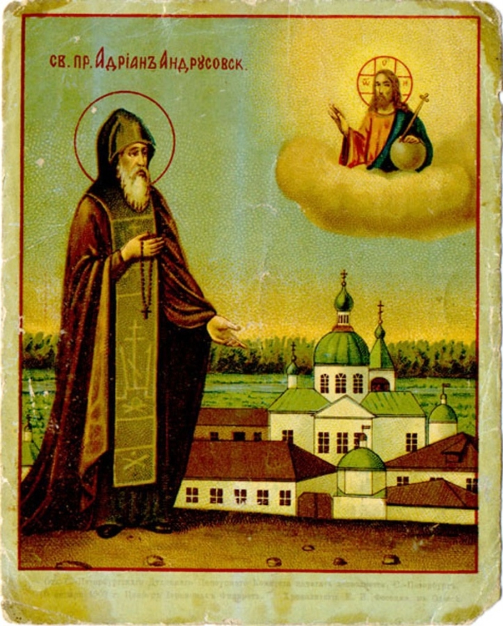 Св. Пр. Адриан Андрусовский. Хромолитография Е. И. Фесенко в Одессе. 1903 г. 14,6 х 11,6 см. Азовский историко-археологический и палеонтологический музей-заповедник.