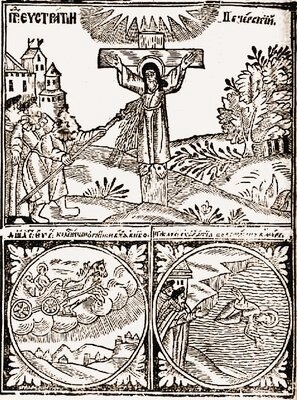Распятие прмч. Евстратия. Вознесение души святого. Иудеи бросают тело святого в море. Ксилография. Мастер Илия (Патерик, или Отечник, Печерский. К., 1661)