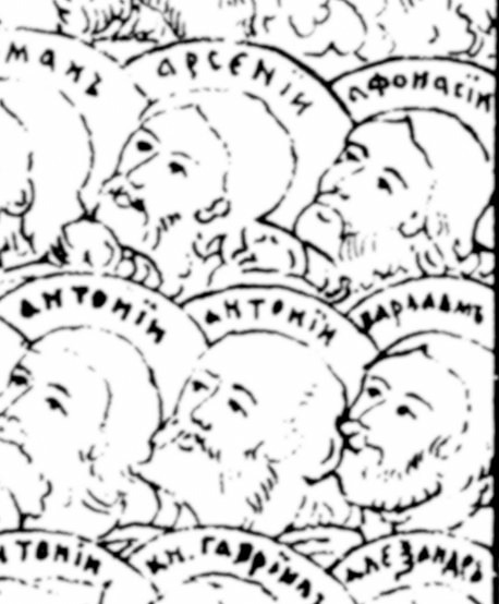 Собор Новгородских святых (фрагмент). Рисунок (прорись с иконы /изображение, кроме подписей святых в нимбах, зеркальное). Россия. XVIII века. Постников, 1899, таб. LXIX. Ретушировано.