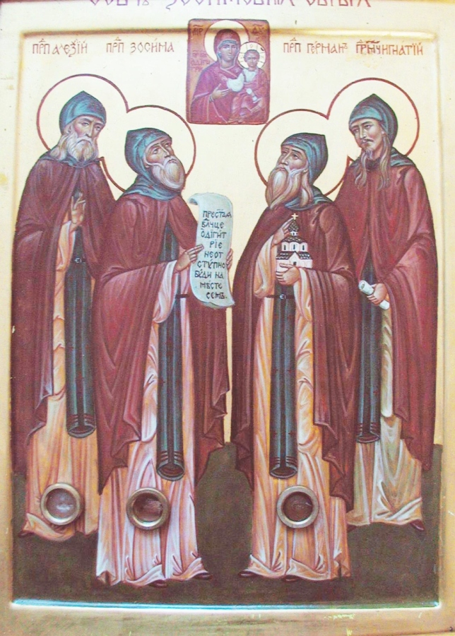 Прпп. Алексий и Герман (фрагмент). Икона. Москва. Около 2002 г. Икона находится у раки мощей прпп. Алексия и Германа.