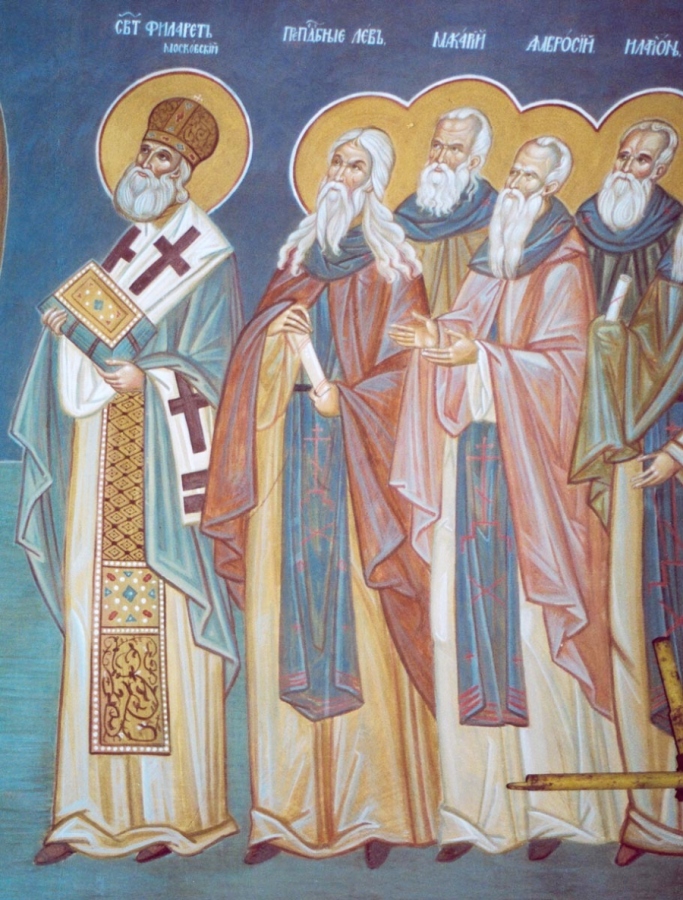 Свв. Оптинские (фрагмент). Иеромонах Илларион и инок Алипий. Фреска алтаря Владимирской церкви. Оптина пустынь. 2003 г.