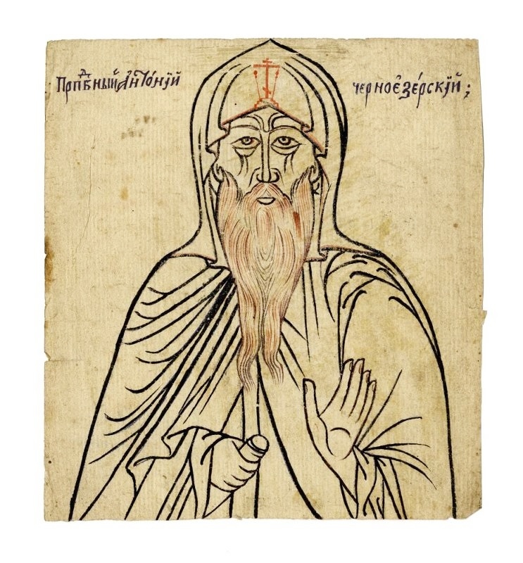 Прп. Антоний Черноезерский. Попов Василий Аверкиевич. Иконный образец. Период создания: XIX в. Материал, техника: бумага, сажа, краска, оттиск, рисунок, скол. 19,3 х 17,5 см. Государственный исторический музей, Москва.