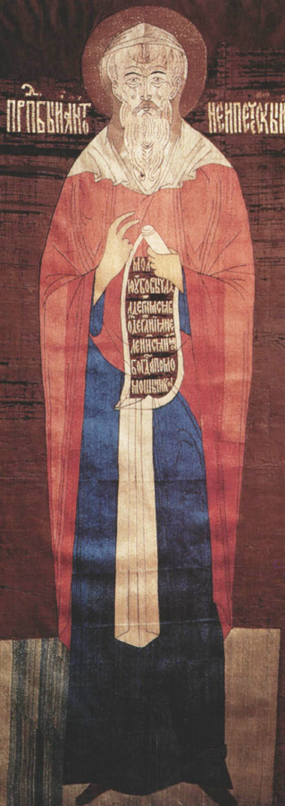 Прп. Антоний Печерский. Шитьё. Москва. Конец XV - начало XVI в. 192 х 76. Вышивался для Киево - Печерского монастыря, но вложен в 1586 г. в Кирилло - Белозерский монастырь. ГРМ. Спб.