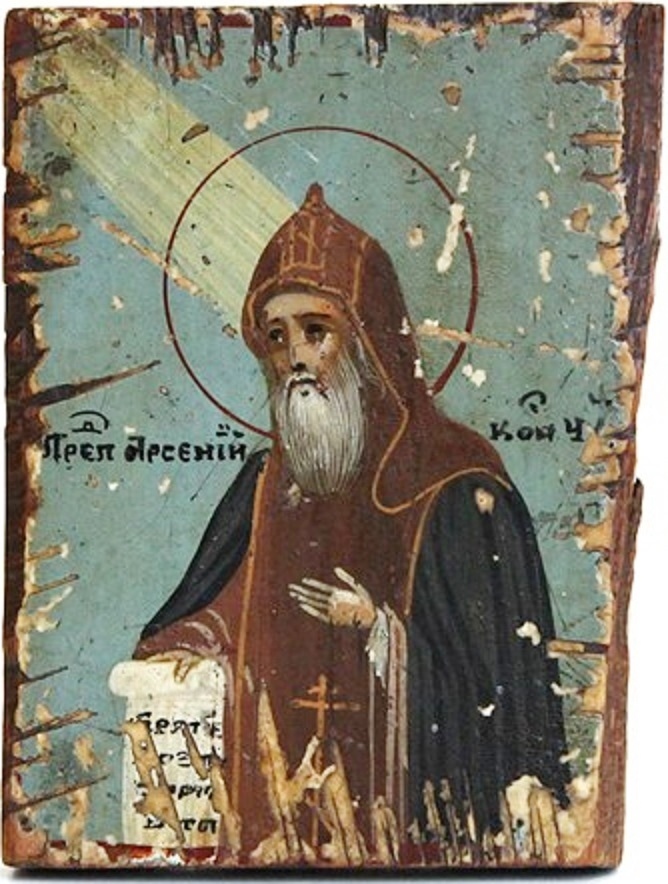 На иконе изображён Преподобный Арсе́ний Коневский.