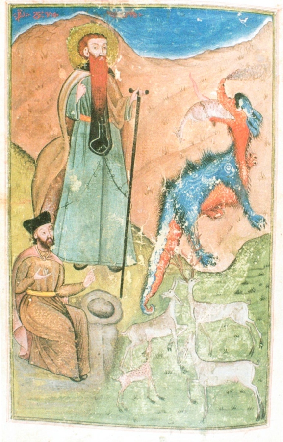 Прп. Давид Гареджийский и прп. Лукиан предает огню дракона, поглотившего маленькую лань. Миниатюра. Грузия. XVIII в. Жития святых. Институт рукописей им. Корнелия Кекелидзе Академии наук Грузии. Тбилиси.