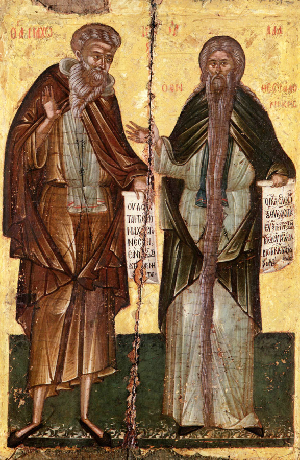 Преподобные Пахомий и Давид Фессалоникийский. Икона. Греция. До 1577 г. 45,5 х 31,5 (или 47 х 32). Монастырь Дионисиат (Афон).