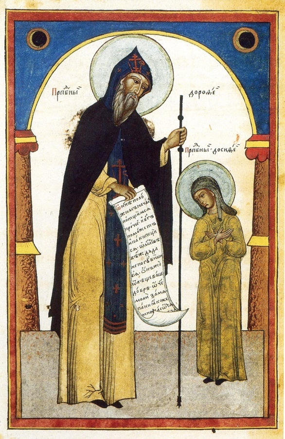 Прпп. Дорофей и Досифей. Миниатюра Поучений аввы Дорофея. Соловецкий монастырь. 1643 год. Из Синодального собрания. ГИМ. Москва.