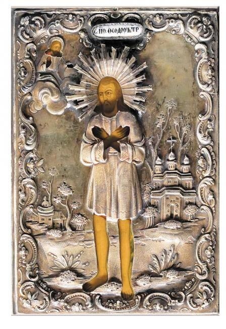 «Святой Преподобный Феодор Трихина» дерево, масло, серебро, позолота, чеканка, ковка, гравировка; 21х14
