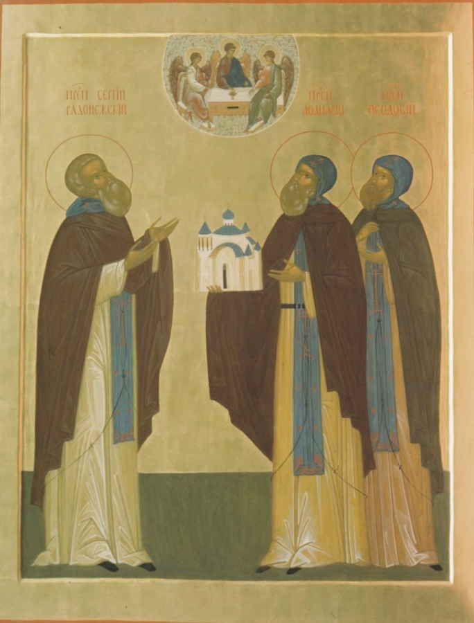 Прп. Сергий Радонежский и прпп. Афанасий, Феодосий Череповецкие. Тарасова С.Л. (Иконопискная школа). Икона. Сергиев Посад. 1990-е годы. Храм Рождества Христова Череповца. Вологодская область.
