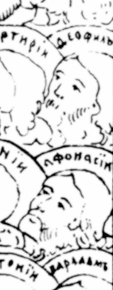Собор Новгородских святых (фрагмент). Рисунок (прорись с иконы /изображение, кроме подписей святых в нимбах, зеркальное). Россия. XVIII века. Постников, 1899, таб. LXIX. Ретушировано.