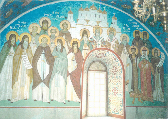 Троицкий Болдин монастырь. Фреска «Собор святых» во Введенской церкви. Преподобные Аркадий и Герасим Болдинские слева.