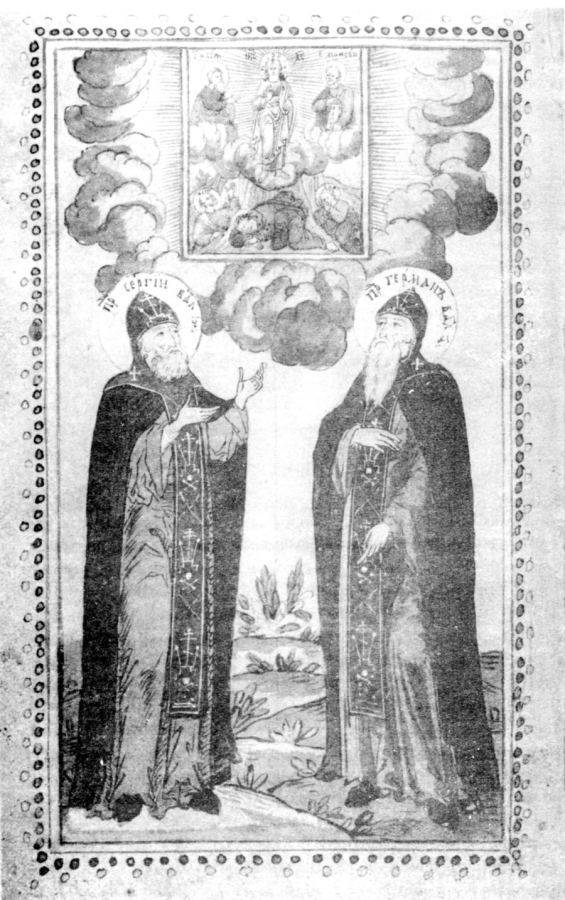 Прпп. Сергий и Герман. Миниатюра "Синодика Валаамского монастыря". Россия. 1765 г. 27 х 16 Из Валаамского монастыря. Ново-Валаамский монастырь. Финляндия.
