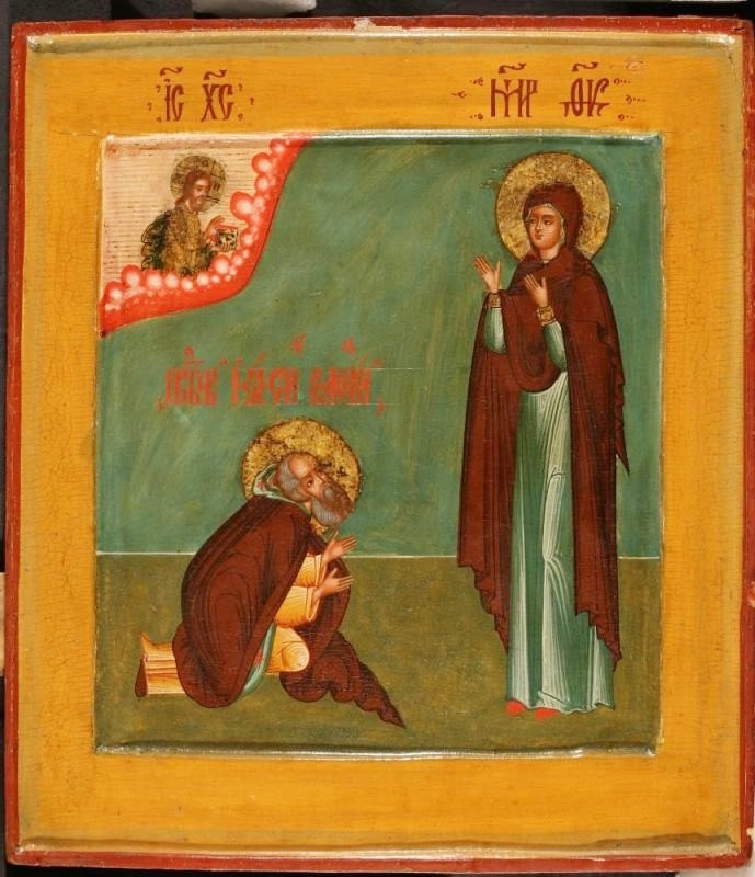 Икона "Преподобный Иосиф Волоцкий в молении Богоматери". Вторая половина XIX в. Материал, техника: дерево, левкас, темпера. 31,5 х 28 х 2,9 см. Череповецкое музейное объединение.