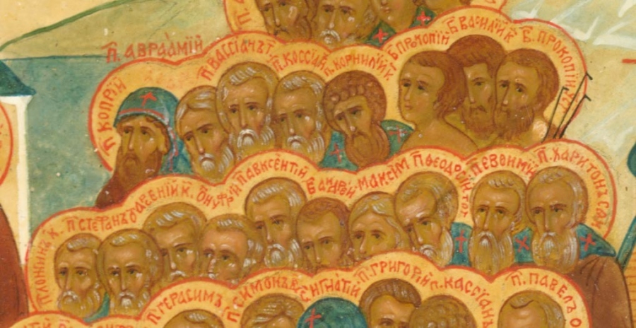 Все святые в земле Российской просиявшие (фрагмент). Монахиня Иулиания (Соколова). Икона. Москва. Конец 1920 - начало 1930 годов. 65.3 Х 53. Из келейных икон свт. Афанасия Ковровского. Ризница Троице-Сергиевой Лавры.