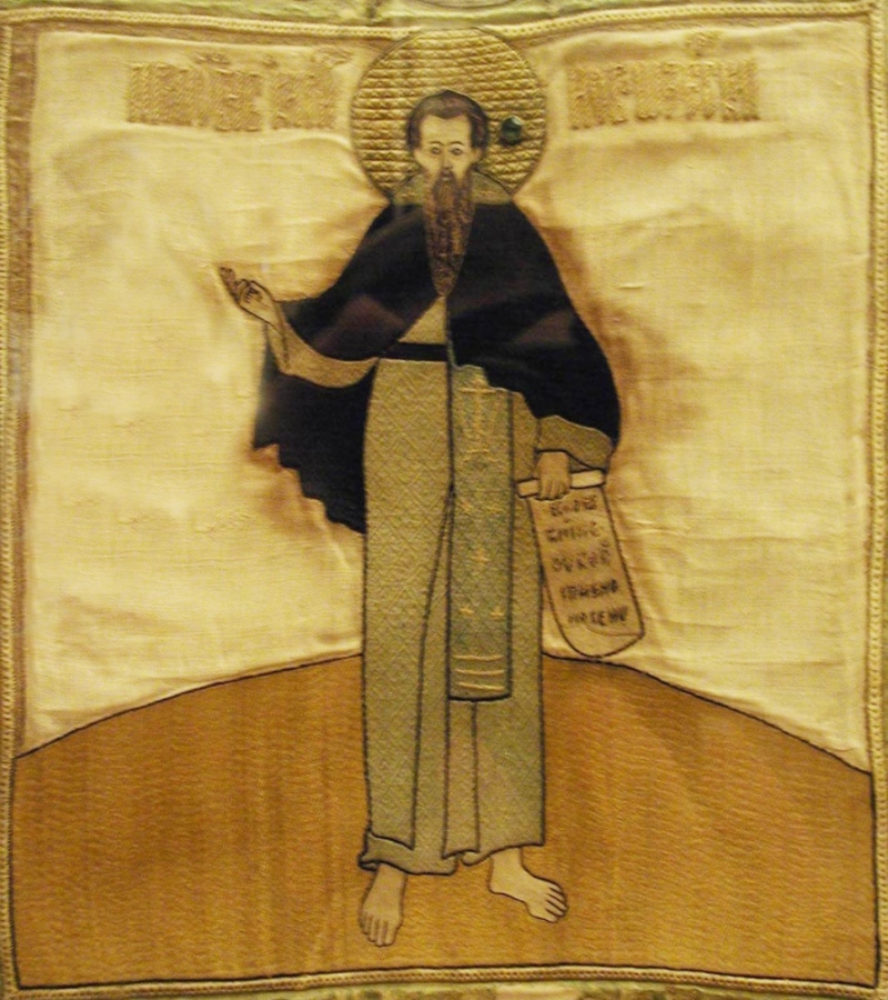 Прп. Кирилл Новоезерский. Шитьё. Русь. 2-я половина XVI - начало XVII вв. 65.5 х 62. В 1913 году поступила в древнехранилище из Кирилло-Новоезерского монастыря. НГОМЗ. Новгород.