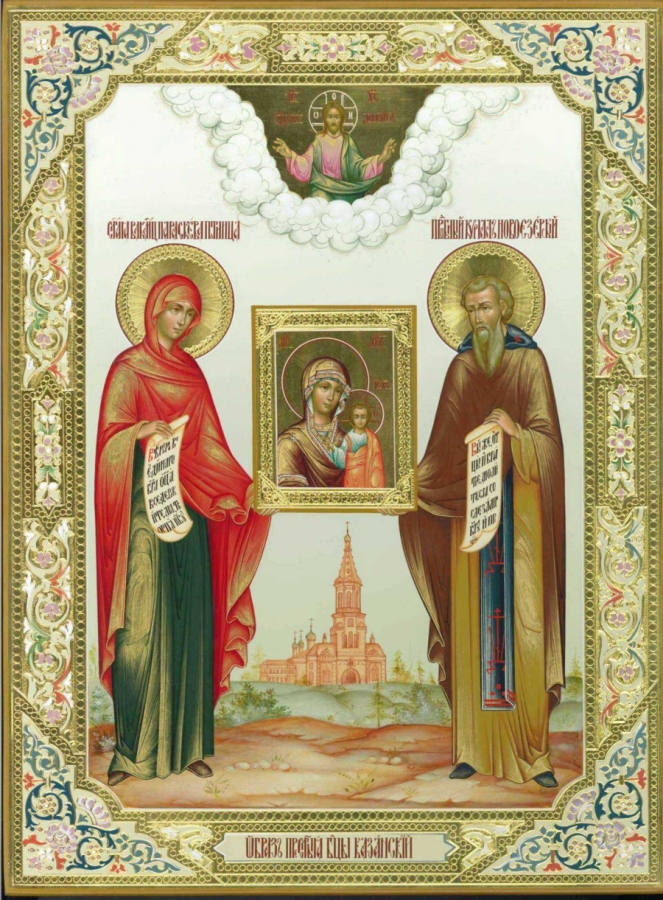 Икона свв. Параскева Пятница и прп. Кирилл Новоезерский с Казанской иконой Богоматери. Современная работа. Иконописная мастерская "Ставрос". г. Ярославль.