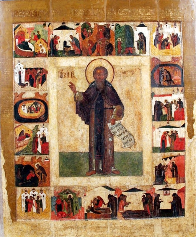Преподобный Кирилл Новоезерский в житии. Ок. 1648 г. 134,5 х 109,5 см. Череповецкое музейное объединение. Происходит из Кирилло-Новезерского монастыря.