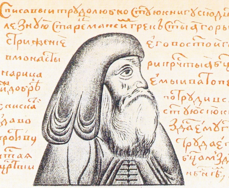 Прп. Максим Грек. Миниатюра из рукописного тома собраний его сочинений. Русь. Конец XVI в.