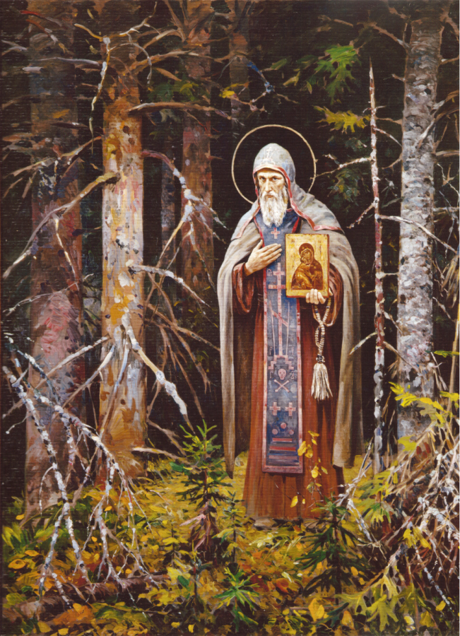 “Нил Столобенский”. Картина, автор - Нестеренко Василий Игоревич. Холст, масло, 200 x 270 см, 2003 г. Репродукция 21.5 x 29 см - Данилова Слобода.