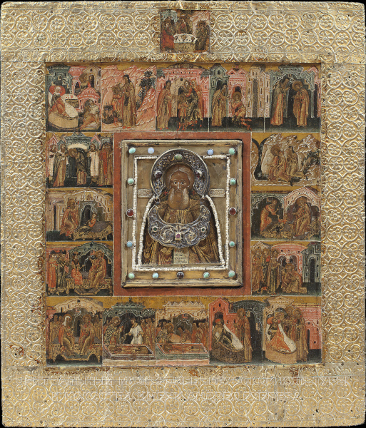 Икона Преподобный Сергий Радонежский, с житием. Середина XVII века. Поволжье. Венец, цата, басма на полях. XVII век; Оклад средника. Конец XVII века