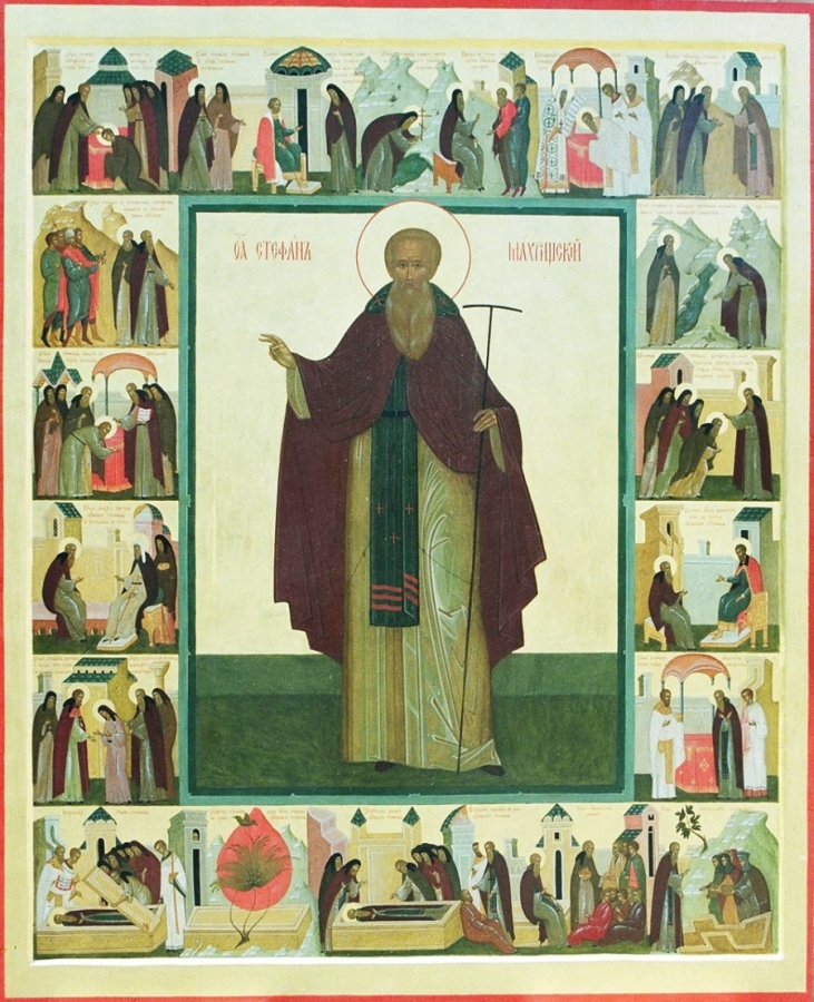 Прп. Стефан Махрищский с житием. Мельникова А.В. (Иконописная школа). Икона. Сергиев Посад. 2000 г. Троице - Стефановский Махрищский монастырь.
