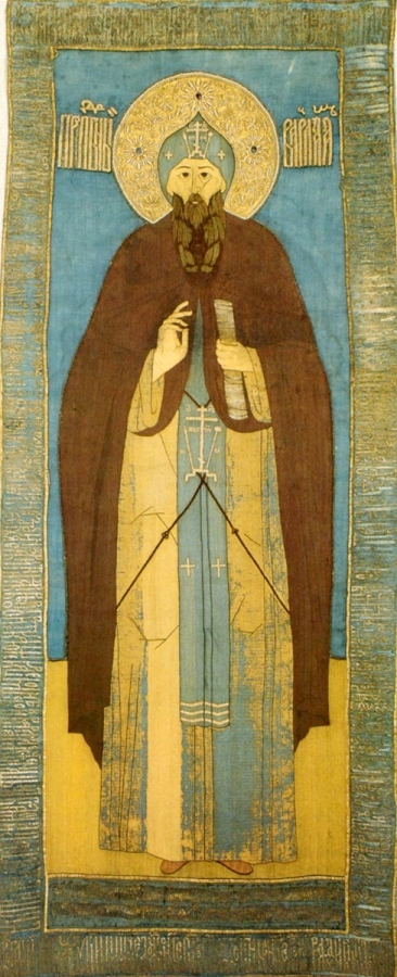 Прп. Варлаам Хутынский. Мастерская царицы Ирины Годуновой. Шитьё. Москва. 1579 г. 244. х 102.5. После 1926 года пелена поступила из Хутынского монастыря. НГОМЗ. Новгород.