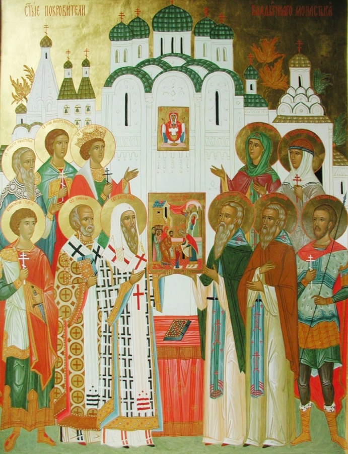 Свв. покровители Серпуховского Владычнего монастыря. Вишневская А.И. (выпускница Иконописной школы 1999 года). Икона. Сергиев Посад. 2005 год. Серпуховской Владычный женский монастырь.