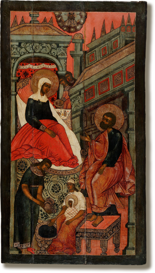 В отличие от широко распространившихся с XVII столетия икон, подробно иллюстрирующих эпизоды из жизни Иоакима и Анны и детства Марии, публикуемый памятник относится к краткому иконографическому изводу, оформившемуся еще в конце XIII столетия. Композиция отличается емкостью и лаконичностью построения, что придает художественному языку произведения максимальную ясность и выразительность. Святая Анна полусидит на высоком ложе, справа к роженице склоняются жены с дарами и золотыми сосудами, – мотив, восходящий к ритуалу церемониального поздравления византийских императриц. У подножия сцена омовения новорожденной Марии: спеленатый младенец сидит на руках повитухи, пробующей воду, которую служанка льет из кувшина в пышную по оформлению серебряную купель. Редкой особенностью извода является включение в композицию фигуры сидящего у ложа Иоакима, причем беседа праведных супругов становится основой образа. Выразительный жест руки Иоакима, обращенной к внимающей ему Анне, как и само его изображение в основном встречается в памятниках поволжского происхождения. Сложные многоуровневые архитектурные кулисы почти полностью заполняют фон иконы и делят композицию на отдельные зоны. Перенесение традиционной иконографической схемы на вытянутый формат доски предопределил своеобразное расположение фигурок двух дев, приносящих дары и изображенных здесь в сжатом палатами пространстве.