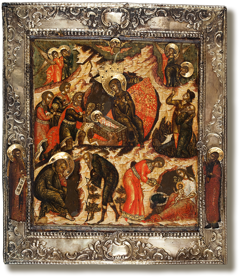 В основу сцены Рождества Христова положены тексты евангельских рассказов о чудесном рождении Девой Марией Младенца Иисуса (Мф. 1, 18–23; 2, 1–12; Лк. 2, 6–20) и ряд апокрифических сочинений, в частности Протоевангелие Иакова. Иконография сцены складывалась в палеологовском искусстве XIV в. и получила распространение в двух основных вариантах, известных в новгородской и московской живописи. Композиционная схема публикуемого памятника во многом восходит к новгородскому изводу и характеризуется отсутствием путешествующих волхвов (они представлены в момент принесения даров) и сокращением числа изображенных ангелов, расположенных лишь в верхней части, на уступах высокой горы. Изображение полусидящей на ложе Богоматери появляется в ряде икон конца XVI – начала XVII в., представляющих собой расширенный извод.