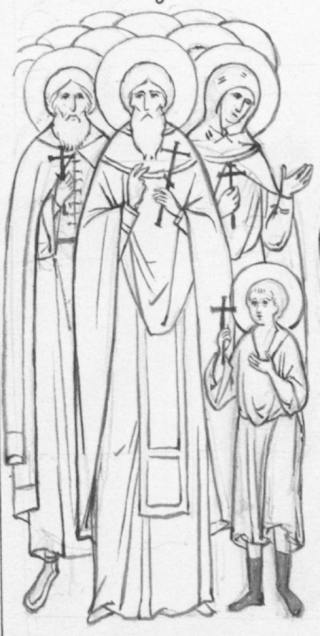 Лицевые святцы русских святых. Январь (лист 1 /единственный сохранившийся лист января/). Монахиня Иулиания (Соколова). Рисунок. Сергиев Посад. 1959-1962 гг. Выполнены по просьбе святителя Афанасия Ковровского /Сахарова/.